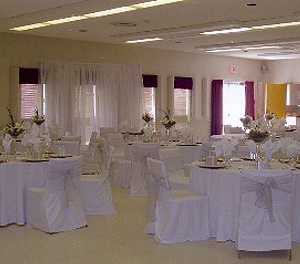 There is a nominal fee to have the hall set up for an event. Groups doing their own hall set up are asked to reconfigure the room (as per the diagram on the storage room wall) with eight round tables placed about the room and one six foot table between the two kitchen doors.